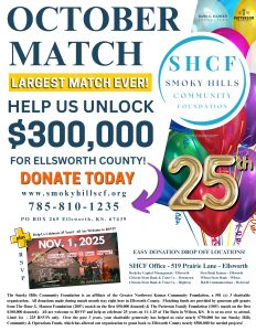 ๐๐๐ญ๐จ๐๐๐ซ ๐๐๐ญ๐๐ก ๐ข๐ฌ ๐๐๐ซ๐. ๐๐ฎ๐ซ ๐๐๐ซ๐ ๐๐ฌ๐ญ ๐๐๐ญ๐๐ก ๐๐ฏ๐๐ซ! This October, your gift to the Smoky Hills Community Foundation goes further than ever before. With the help of our generous partners,